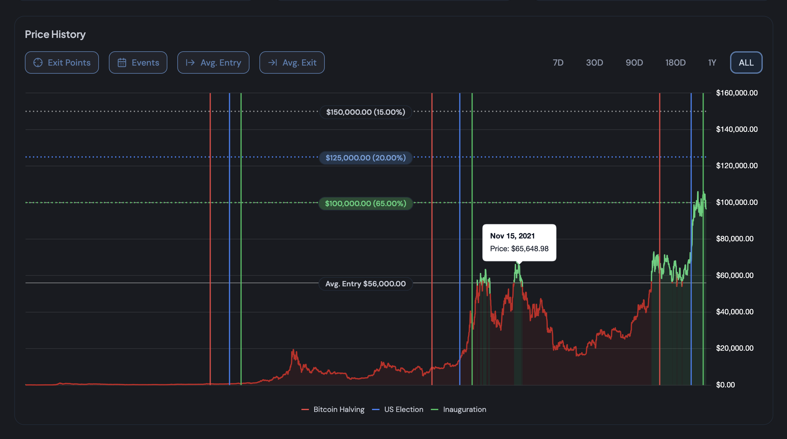 Review historical charts, with togglable events, avg. entry/exit points, and strategic exits to help you make more informed decisions. Data is streamed from the CoinGecko API.